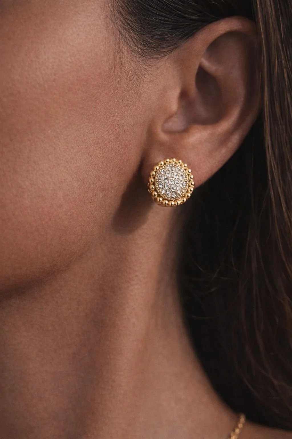 The Zahara necklace us both sculptural and striking. This gold-plated necklace features a sleek row of geometric links, each delicately set with shimmering pavé stones for a refined, radiant finish. Designed to sit gracefully along the neckline, it catches the light with every movement—effortlessly elevating both everyday looks and evening styling.